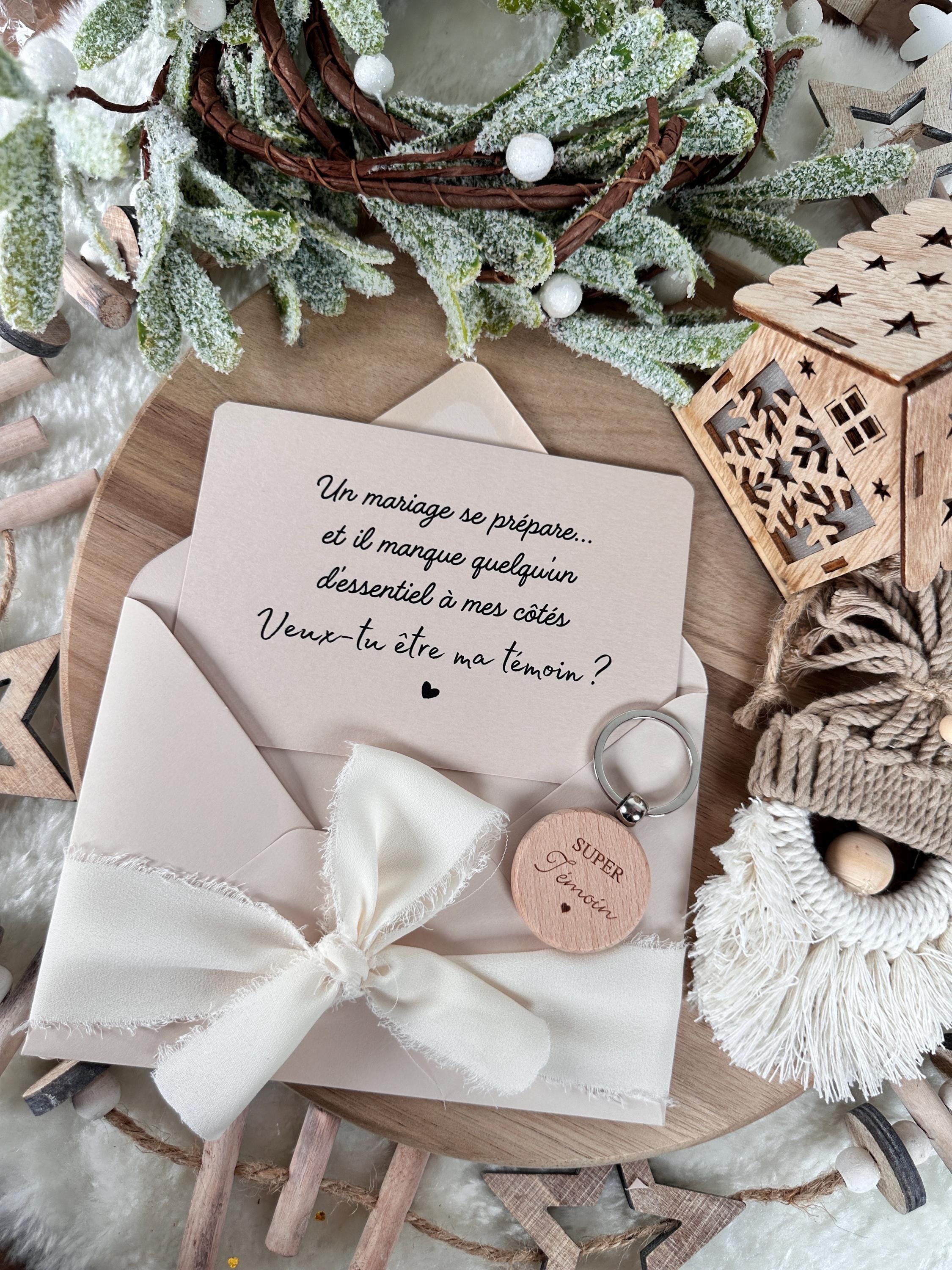 Porte-clé en bois et carte pour demander votre témoin de mariage